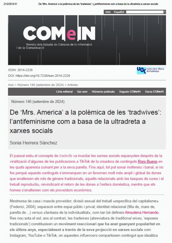 En: COMeIN [en línia], setembre2024, no. 146. ISSN: 1696-3296.Resumen: "El passat estiu el concepte de tradwife va inundar les xarxes socials espanyoles després de la viralització d’algunes de les publicacions a TikTok de la creadora de continguts Roro Bueno en les quals apareixia cuinant per a la seva parella. Fins aquí, tot pot sonar inofensiu i banal, si no fos perquè aquests continguts s’emmarquen en un fenomen molt més ampli i global de dones que enalteixen els rols de gènere tradicionals, aquells relacionats amb les tasques de cures i eltreball reproductiu, reivindicant el retorn de les dones a l’esfera domèstica, mentre que els homes s’enalteixen com els proveïdors econòmics."