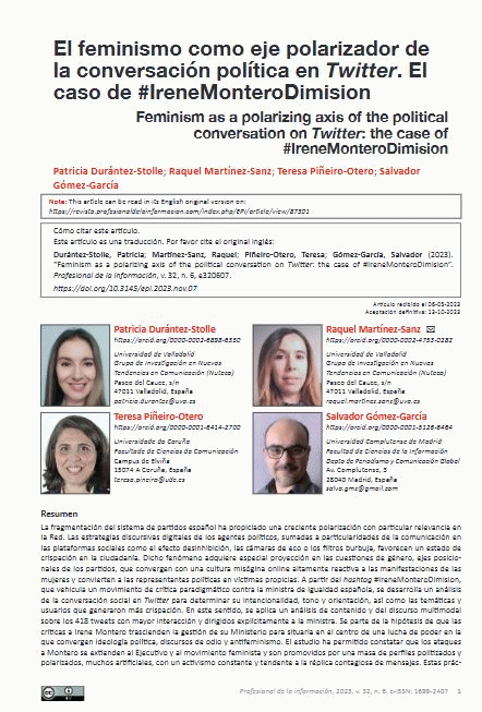 "La fragmentació del sistema de partits espanyol ha propiciat una creixent polarització amb particular rellevància en la Xarxa. Les estratègies discursives digitals dels agents polítics, sumades a particularitats de la comunicació en les plataformes socials com l'efecte desinhibició, les cambres de ressò o els filtres bombolla, afavoreixen un estat de crispació en la ciutadania. Aquest fenomen adquireix especial projecció en les qüestions de gènere, eixos posicionals dels partits, que convergeixen amb una cultura misògina en línia altament reactiva a les manifestacions de les dones i converteixen a les representants polítiques en víctimes propícies. A partir de l'etiqueta #*IreneMonteroDimision, que vehicula un moviment de crítica paradigmàtic contra la ministra d'Igualtat espanyola, es desenvolupa una anàlisi de la conversa social en Twitter per a determinar la seva intencionalitat, to i orientació, així com les temàtiques i usuaris que van generar més crispació. L'estudi ha permès constatar que els atacs a Montero s'estenen a l'Executiu i al moviment feminista i són promoguts per una massa de perfils polititzats i polaritzats, molts artificials, amb un activisme constant i tendent a la rèplica contagiosa de missatges."