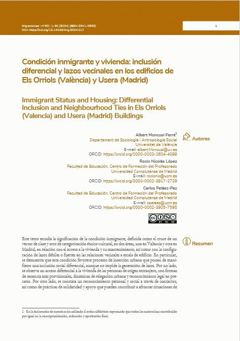 Condición inmigrante y vivienda : inclusión diferencial y lazos vecinales en los edificios de Els Orriols (València) y Usera (Madrid) / Albert Moncusí Ferré, Rocío Nicolás López, Carlos Peláez Paz [Recurs electrònic]