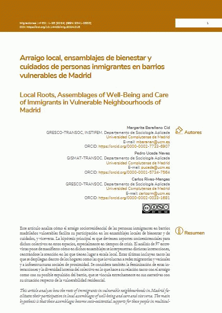 En: Migraciones, nº 62, 2025Resumen: "Aquest article analitza com l'arrelament soci residencial de les persones immigrants en barris madrilenys vulnerables facilita la seva participació en els acoblaments locals de benestar i decuidats, i viceversa. La hipòtesi principal és que esdevenen suportis soci existencials per a aquests col·lectius en aquests espais, especialment en temps de crisis. L'anàlisi de 97 entrevistes posa de manifest com en aquests acoblaments es donen diferents interaccions, centrant-se l'atenció en les quals tenen lloc a escala local. Aquestes últimes inclouen tant les que es despleguen dins de les llars com les que involucren a xarxes migratòries i veïnals i a infraestructures socials de proximitat. Es considera també la feminització d'aquestes interaccions i la diversitat interna del col·lectiu en el que fa a la seva relació tant amb l'arrelament com amb la seva possible expulsió del barri, que es vincula estretament en les seves narratives amb la seva situació respecte de la vulnerabilitat residencial."