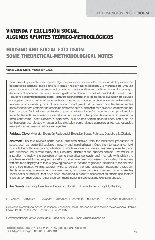 En: Trabajo Social Hoy, 2022, n.º97 (p. 73-93)Resumen: "El present text repassa algunes problemàtiques socials derivades de la producció neoliberal de l'espai, com ara l'exclusió residencial, la pobresa i la marginació. Una vegada presentat el context internacional en què es va gestar la situació politicoeconòmica a la qual devem l'escenari present, com igualment descrita l'actual realitat del nostre país -deutora del context esbossat-, estarem en condicions de revisar l'evolució d'alguns conceptes teòric-metodològics centrals amb què s'han vingut abordant les problemàtiques relatives a l'habitatge i l'exclusió social, concloent el recorregut amb les eines desplegades per a enfrontar un problema creixent davant el sotmetiment global als dictats del lliure mercat. Tot això, sense pretendre esgotar la nodrida discussió respecte a una problemàtica lamentablement en augment i de rabiosa actualitat, ni tampoc descartar l'existència d'altres estratègies -institucionals o populars- que s'han vingut desenvolupant amb la finalitat de contrarestar els seus efectes i restaurar les ciutats com a béns comuns abans que espais mercantilitzats, jerarquitzats i excloents."