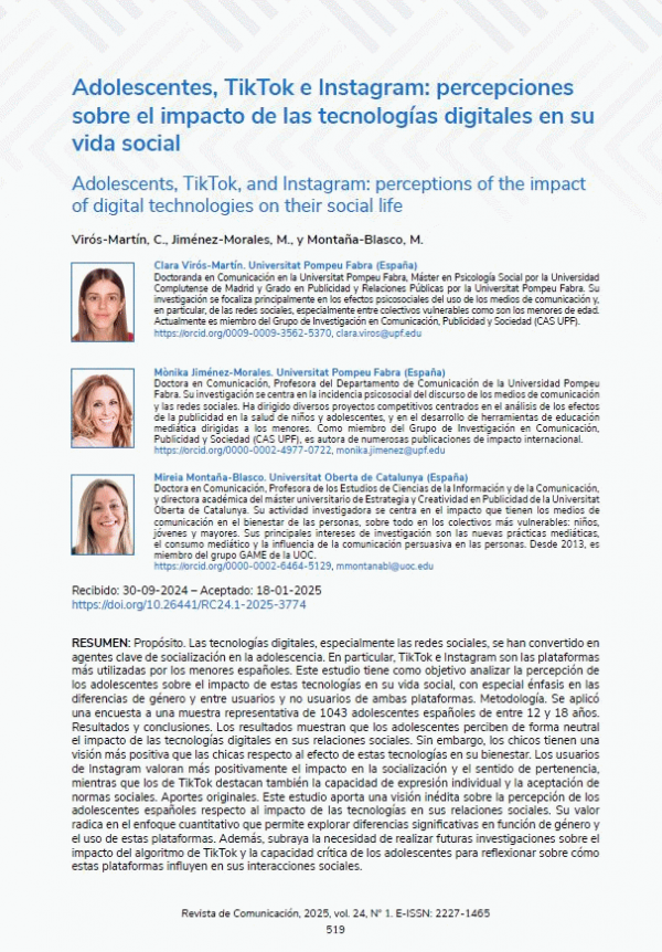 En: Revista de Comunicación, 2025, vol. 24, N° 1. E-ISSN: 2227-1465Resumen: "Aquest estudi té com a objectiu analitzar la percepció dels adolescents sobre l'impacte d'aquestes tecnologies en la seva vida social, amb especial èmfasi en les diferències de gènere i entre usuaris i no usuaris de totes dues plataformes"