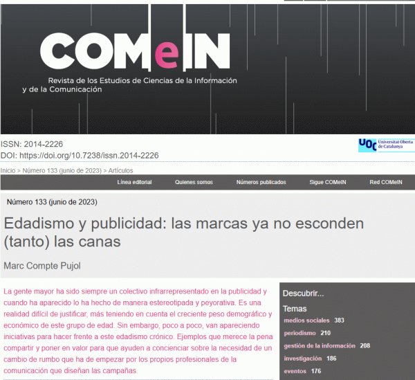 En: COMeIN: Revista dels Estudis de Ciències de la Informació i de la Comunicació, Nº. 133, 2023Resumen: "La gent gran ha estat sempre un col·lectiu infrarepresentat en la publicitat i, quan ha aparegut, ho ha fet de manera estereotipada i pejorativa. És una realitat difícil de justificar, més tenint en compte el creixent pes demogràfic i econòmic d’aquest grup d’edat. A poc a poc, però, van apareixent iniciatives per fer front a aquest edatisme crònic. Exemples que val la pena compartir i posar en valor perquè ajudin a conscienciar sobre la necessitat d’un canvi de rumb que ha de començar pels professionals mateix de la comunicació que dissenyen les campanyes."