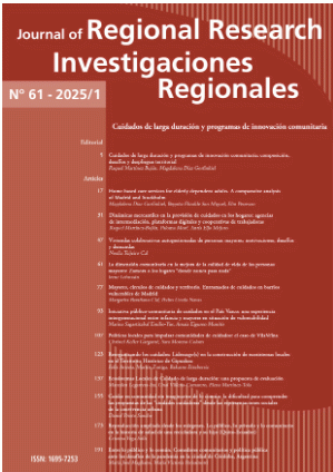 Investigaciones Regionales - Journal of Regional Research, vol 61, núm 1, 2025Summary: "Aquest monogràfic realitza una breu anàlisi que relaciona el desenvolupament de les cures de llarga durada a Espanya en els últims anys amb les iniciatives desenvolupades en diferents territoris. S'enquadra dins dels processos de deliberació i reflexió respecte a les reformes de la política pública de cures a Espanya en un context post-pandèmic, reflectint l'interès per mètodes i pràctiques de polítiques amb un enfocament comunitari organitzat des de diferents realitats territorials."