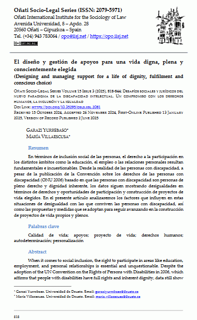 En: Oñati socio-legal series, Vol. 15, Nº. 3, 2025 Resumen: "En termes d'inclusió social de les persones, el dret a la participació en els diferents àmbits com l'educació, l'ocupació o les relacions personals resulten fonamentals i inqüestionables. Des de la realitat de les persones amb discapacitat, malgrat la publicació de la Convenció sobre els drets de les persones amb discapacitat (ONU 2006) basat en el fet que les persones amb discapacitat són persones de ple dret i dignitat inherent, les dades continuen mostrant desigualtats en termes de drets i oportunitats de participació i construcció de projectes de vida triats. En el present article analitzarem els factors que influeixen en aquestes situacions de desigualtat amb les quals conviuen les persones amb discapacitat, així com les propostes i mesures que s'adopten per a continuar avançant en la construcció de projectes de vida propis i plens."