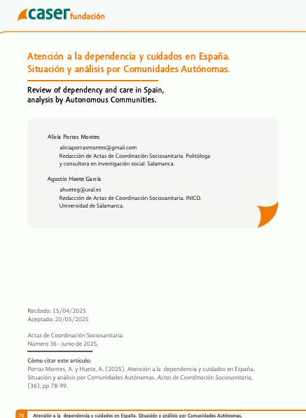 Actas de Coordinación Sociosanitaria, 2025, (36), pp 78-99. Summary: "S'analitza la situació actual de l'atenció a la dependència mitjançant una comparativa entre Comunitats Autònomes a Espanya. Per a això s'ha realitzat una revisió bibliogràfica de literatura científica centrada en els termes “dependència” i “comptes” amb perspectiva autonòmica. Les bases de dades en les quals es va realitzar la cerca van ser Dialnet, Google Scholar i Scielo, en el període 2018-2025. Els resultats mostren l'existència de grans desigualtats territorials quant a població i envelliment, finançament, valoració de la dependència, llistes d'espera i recursos disponibles en serveis socials. A Espanya la cura de les persones majors i/o dependents és dut a terme en la seva majoria per la família, en concret per la dona. Aquesta tendència suposa que la prestació econòmica per a cures en el mitjà familiar és la més freqüent en gairebé totes les regions."