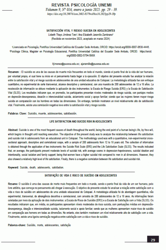 "El suïcidi és una de les causes de mort més freqüents a tot el món, sent el punt final de la vida de l'ésser humà, per voluntat pròpia, el qual té el seu inici en el pensament fins a arribar a l'execució. L'objectiu del present estudi va ser analitzar la relació entre la satisfacció vital i el risc suïcida en adolescents d'una unitat educativa de Cotopaxi. La metodologia utilitzada va ser amb enfocament quantitatiu, no experimental de tall transversal, abast descriptiu i correlacional, amb una mostra de 200 adolescents de 12 a 18 anys. La recol·lecció d'informació es va obtenir mitjançant l'aplicació de dos instruments: l'Escala de Risc Suïcida i l'Escala de Satisfacció Vital. Els resultats van indicar que, en mitjana, els participants presenten nivells moderats de risc suïcida, amb puntuació mitjana en depressió-desesperança, ideació i intencionalitat suïcida, aïllament social i suport familiar; sent que les dones tenen major risc suïcida en comparació amb els homes en totes les dimensions. No obstant això, també van mostrar un nivell relativament alt de satisfacció vital. Finalment, existeix una correlació negativa lleu entre la satisfacció vital i risc suïcida."