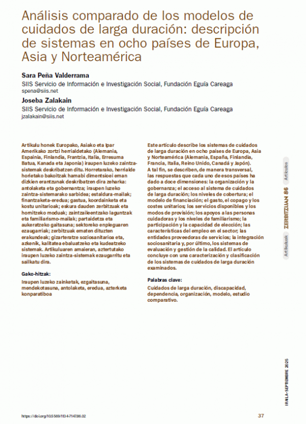 En: Zerbitzuan, num 86, setembre 2025Resumen: "Aquest article descriu els sistemes de cures de llarga durada en vuit països d'Europa, Àsia i Amèrica del Nord (Alemanya, Espanya, Finlàndia, França, Itàlia, el Regne Unit, el Canadà i el Japó). A tal fi, es descriuen, de manera transversal, les respostes que cadascun d'aquests països ha donat a dotze dimensions: l'organització i la governança; l'accés al sistema de cures de llarga durada; els nivells de cobertura; el model de finançament; la despesa, el copagament i els costos unitaris; els serveis disponibles i els modes de provisió; els suports a les persones cuidadores i els nivells de familiaritat; la participació i la capacitat d'elecció; les característiques de l'ocupació en el sector; les entitats proveïdores de serveis; la integració sociosanitària i, finalment, els sistemes d'avaluació i gestió de la qualitat. L'article conclou amb una caracterització i classificació dels sistemes de cures de llarga durada examinats."